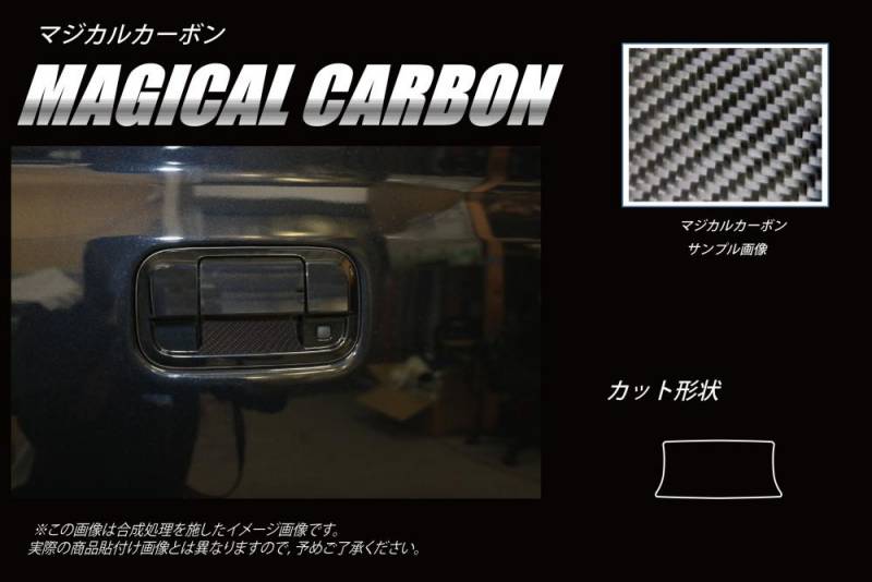 本製品は、カーボン調シートではなく、本カーボンシート(マジカルカーボン)を使用しているので、最適な厚みがあり、ドアハンドル、ドアの部周りをしっかりと保護、プロテクトしてくれます。マジカルカーボンは、柔軟性に優れた素材でドアの曲面にもピッタリとフィットして、防水性や防塵効果も抜群です。