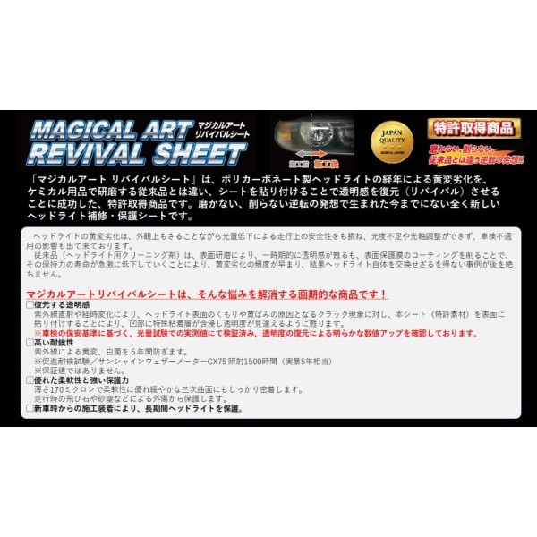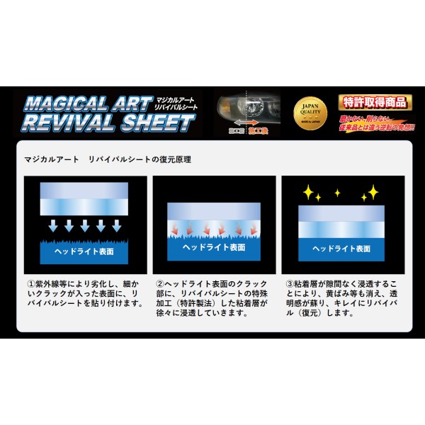 紫外線直射や経時劣化により、ヘッドライト表面の曇りや黄ばみの原因となるクラック現象に対し、本シート(特許素材)を表面に貼り付けることにより、凹部に特殊粘着層が徐々に浸透し、透明度が見違えるように甦ります。